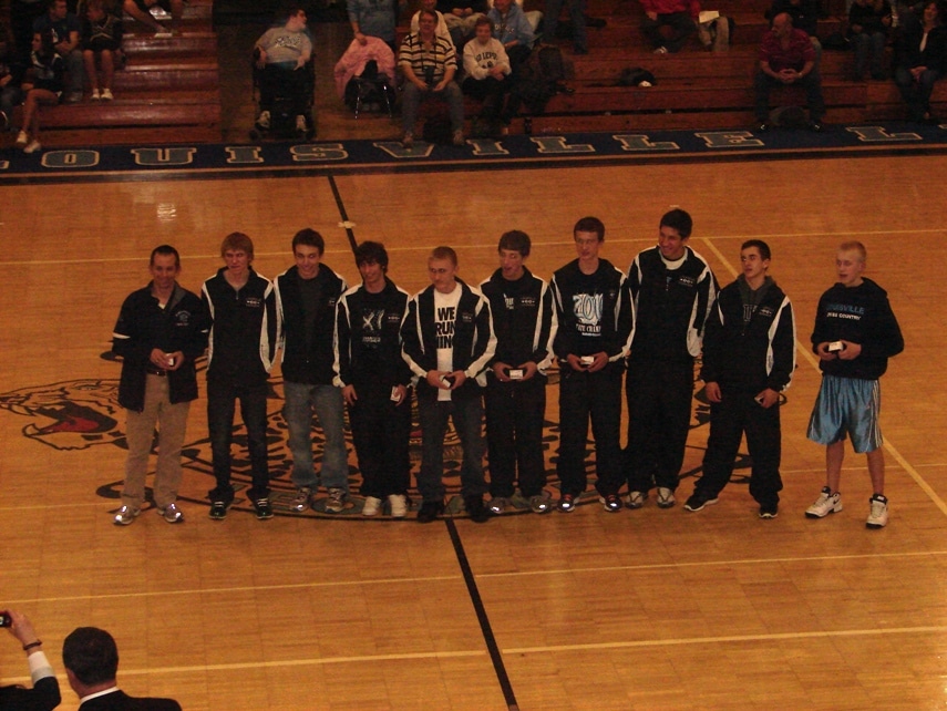 The Louisville Leopards Boys Cross Country team was honored at halftime of the final home basketball game of the year last Thursday in the Louisville Gymnasium.